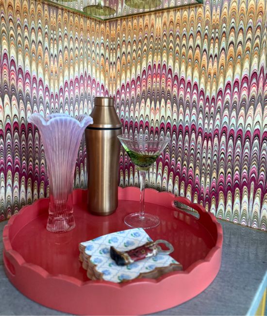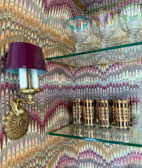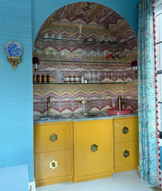 There was a lot of back-n-forth, indecision, wrong wallpaper, not enough wallpaper, change of plans for the shelving, switching out lighting and all kinds of chaos in the process of this DIY arched bar project.