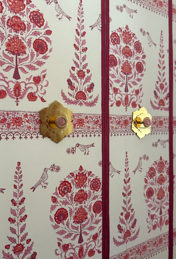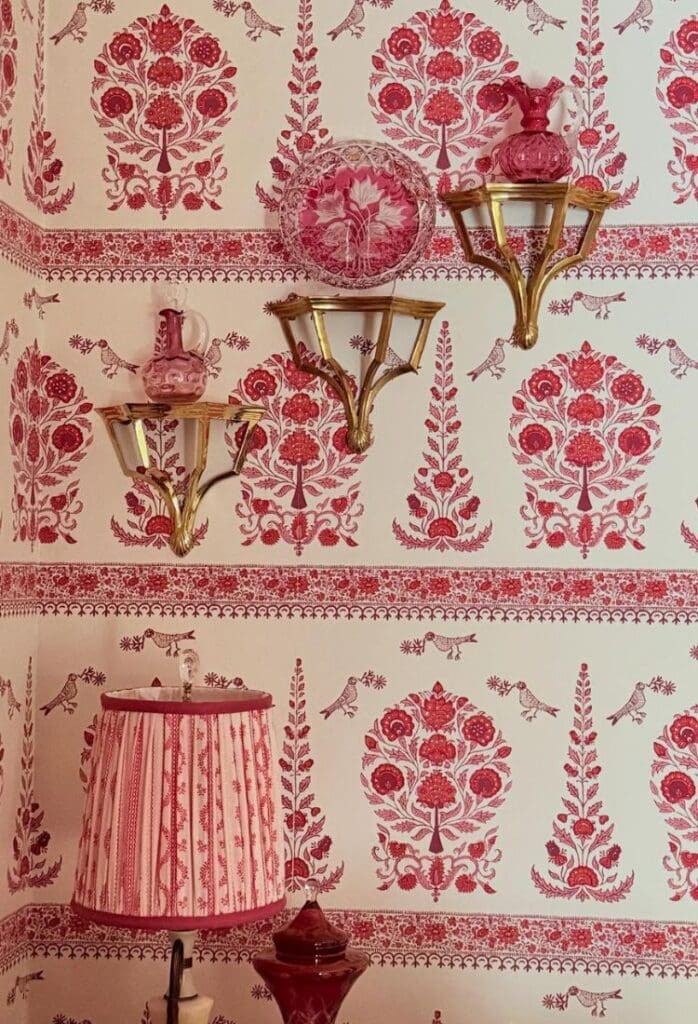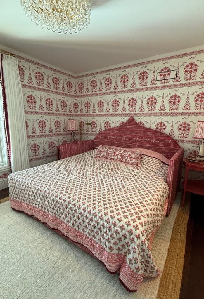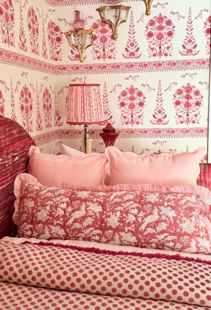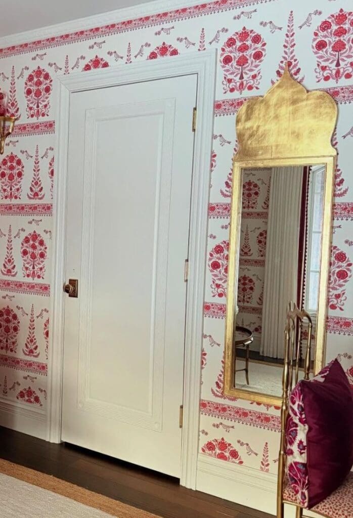 The soul of this room is the Quadrille Kalamkari border wallpaper from @quadrillefabrics. I fell in love with it the moment I saw it in a tiny powder room, and once it went up here, everything else just fell into place. It instantly brought back memories of traveling through India as a child with my dad, so the room naturally became a personal homage to those moments.