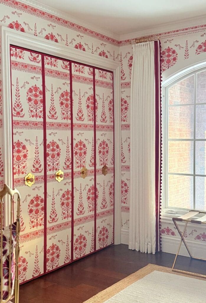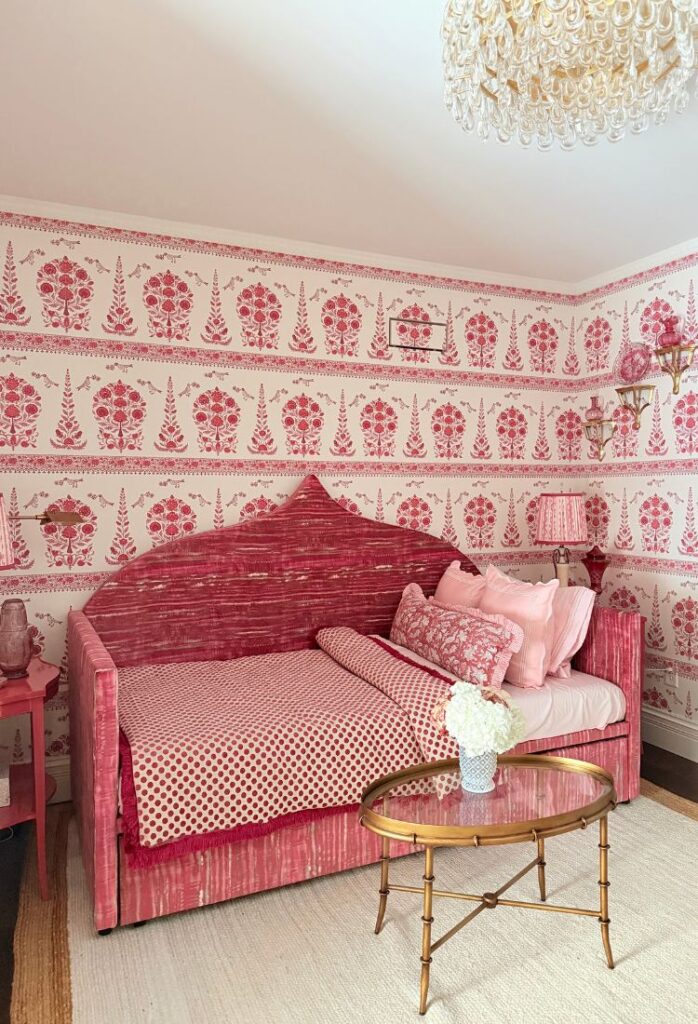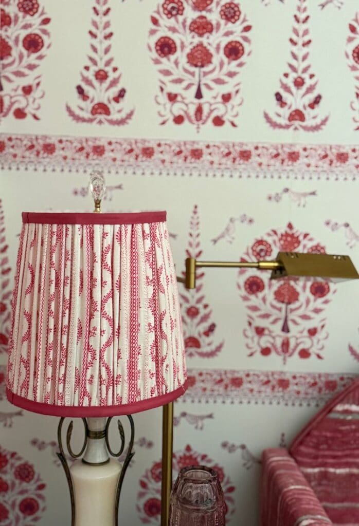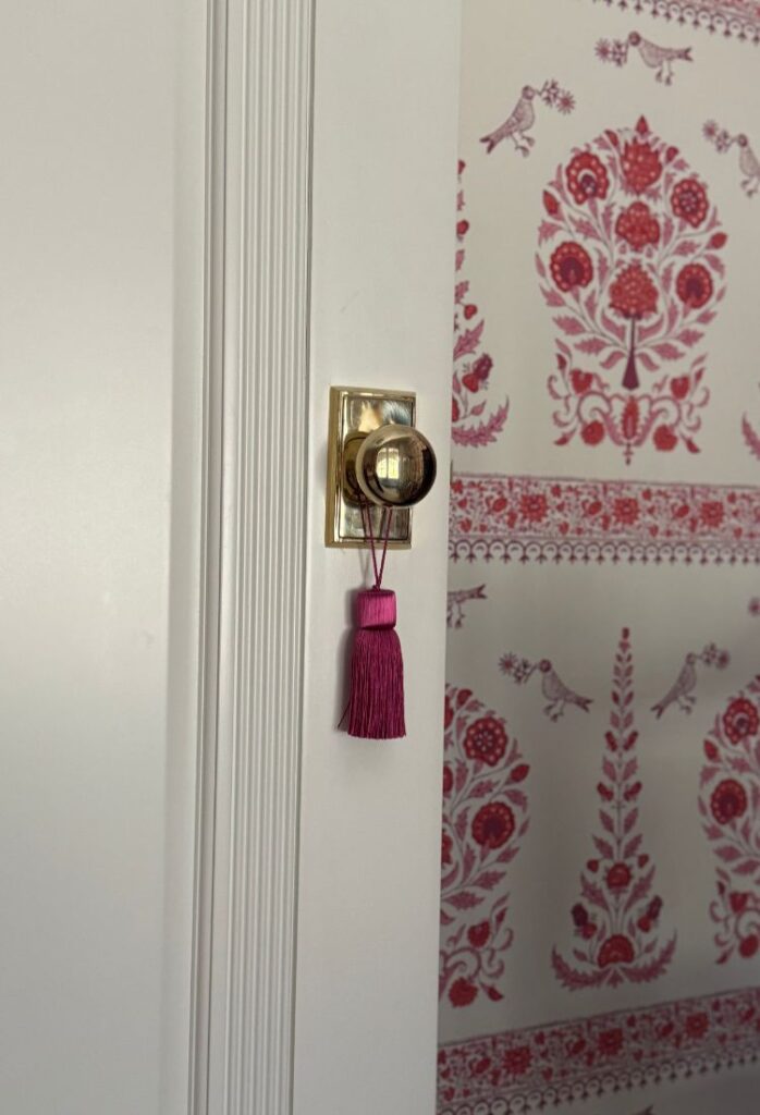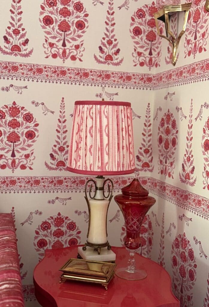 The soul of this room is the Quadrille Kalamkari border wallpaper from @quadrillefabrics. I fell in love with it the moment I saw it in a tiny powder room, and once it went up here, everything else just fell into place. It instantly brought back memories of traveling through India as a child with my dad, so the room naturally became a personal homage to those moments.