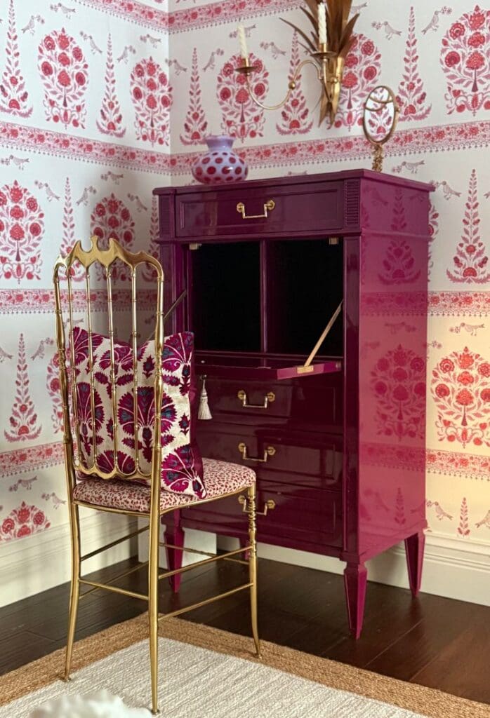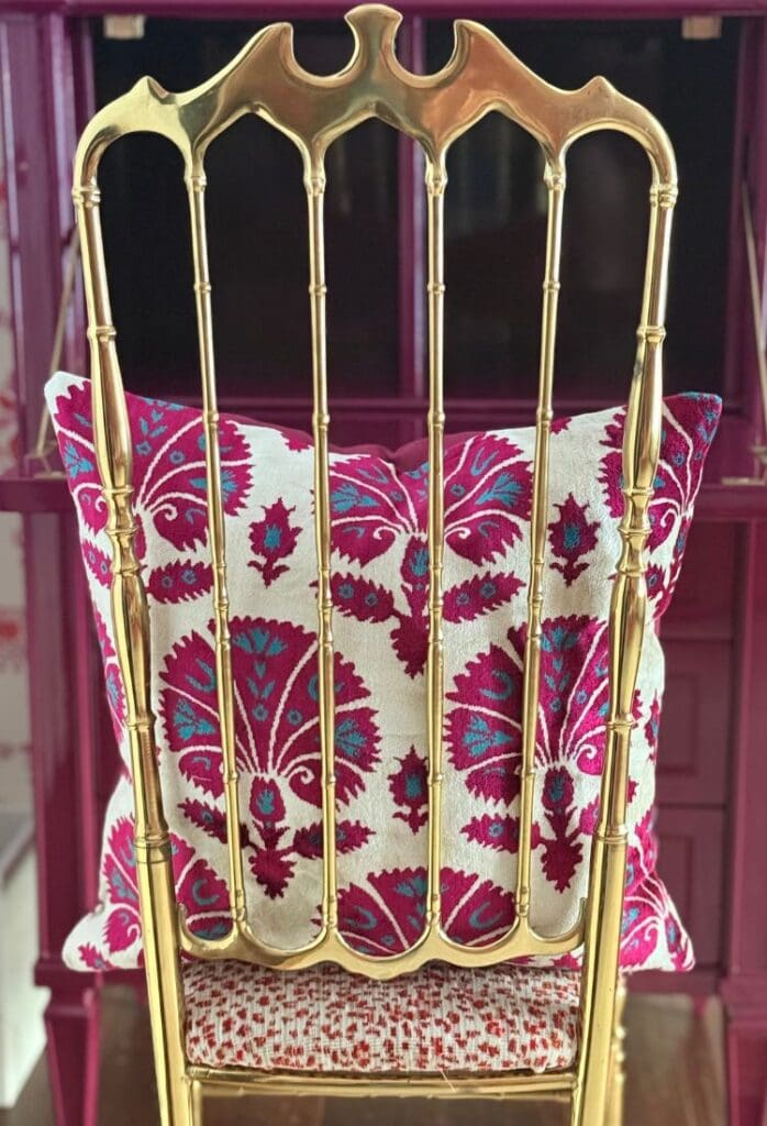 This little desk (from The Resplendent Crow) had been sitting in my shop for years, waiting for its moment. It finally found its home in this space, paired with the most stunning brass chair from @adayintheleifhouse, upholstered in fabric from @winstonfabrics. Even the marble trash can got an upgrade because yes, the trash can can be chic.