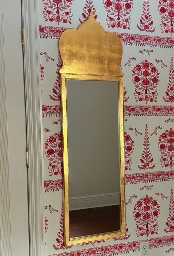 - The full-length mirror—an absolute guest-room essential—was made by my husband, inspired by palace domes in India.
